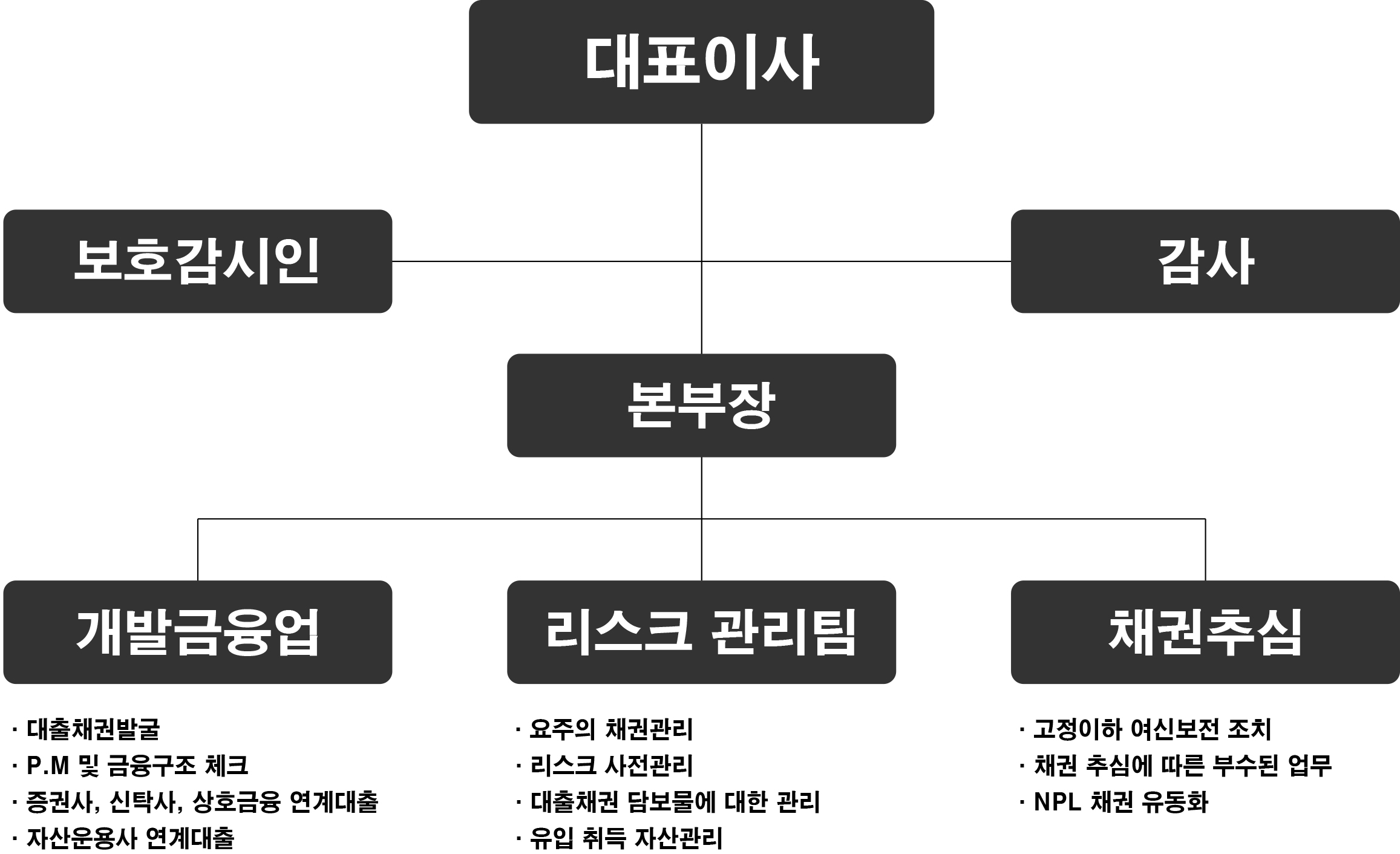 당사는 해당분야의 전문가들이 NPL투자 및 자산관리 업무 등을 담당하고 있으며, 채권금융기관, 증권사, 전문NPL투자회사, 자산운용사들과 다양한 파트너쉽을 형성하고 있으며 법무법인, 회계법인 등 전문가 네트워크를 구축하여 종합금융그룹으로 성장을 목표로 하고 있습니다.